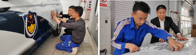 5為:售后漆工冶龍正在為警車貼警徽標(biāo)志,他說:“警車是公務(wù)用車,每次粘警飾我都感到很神圣,干活兒特別用心細(xì)致,一定要把車身警飾做得非常好才行。警徽閃耀,守望千家萬戶。我是漆工也是工匠,必須精益求精,把活兒干漂亮,這也是汽貿(mào)漆工的臉面。每次我都把車清洗干凈,用卷尺量好間距,用記號筆畫好。在貼的過程中用刮板反復(fù)擠壓空氣,這樣才能使警徽粘得更牢固更美觀。我要把公司倡導(dǎo)的勞動精神、工匠精神,通過不斷地學(xué)習(xí)鍛煉,提高本領(lǐng),把精湛的工匠手藝和貼心的服務(wù)傳遞給社會。