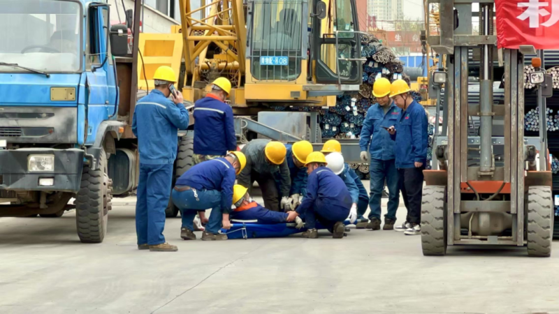 本次演練模擬鋼板區(qū)在進行吊裝作業(yè)時突發(fā)輪胎起重機吊裝貨物擺幅過大傷人事故。演練前期,制定了詳細方案并組織培訓,籌備救援、醫(yī)療等物資,布置模擬場景。演練啟動后,通訊聯(lián)絡組迅速傳遞事故信息,現(xiàn)場指揮組即刻啟動應急響應。警戒疏散組快速隔離現(xiàn)場、疏散人員;應急救援組解救受傷人員、排除設備故障;醫(yī)療救護組對傷員緊急救治并送醫(yī);后勤保障組及時供應物資,各環(huán)節(jié)有序推進。