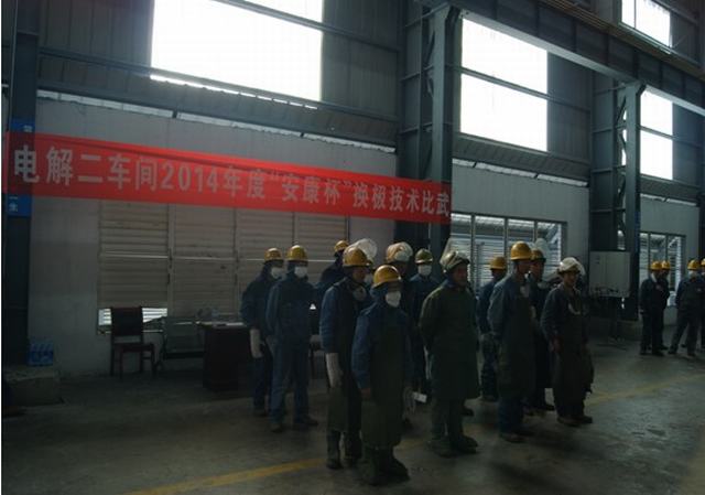 青海物產(chǎn)工業(yè)投資有限公司全面啟動(dòng)"安康杯"競賽活動(dòng)。2014年4月15日上午電解二車間舉行了"安康杯"換極技術(shù)比武大賽。公司副總經(jīng)理張?jiān)手?,副總?jīng)理、工會主席張秉瑜,總經(jīng)理助理秦建峰出席了開幕式。