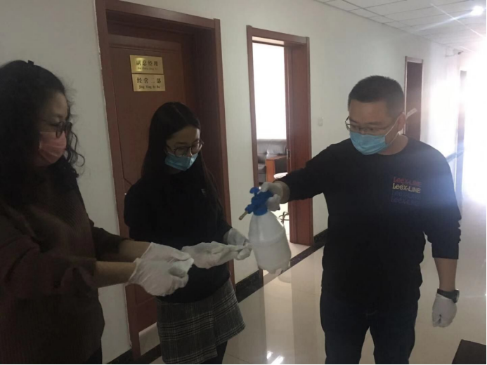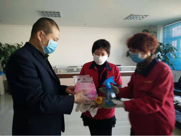 守護職工筑牢"安全防線":物產(chǎn)配送公司黨委通過配發(fā)酒精40公斤、84消毒液6瓶、消毒濕巾等防控器具,及時組織黨員指導職工進行防控工作,重點對宿舍、辦公室、值班室、洗手間門把手、辦公桌椅等進行噴灑消毒。